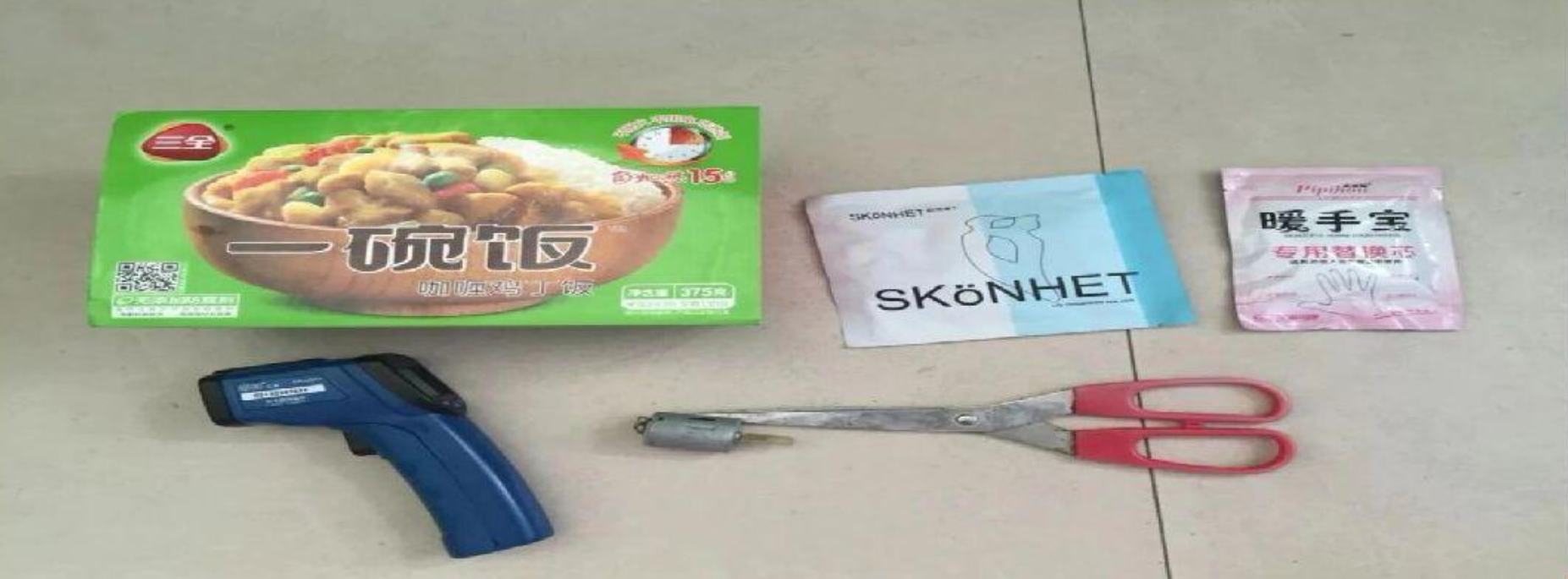 超市里买来的蒸汽眼罩、暖手宝和自热米饭;剪刀;红外线测温