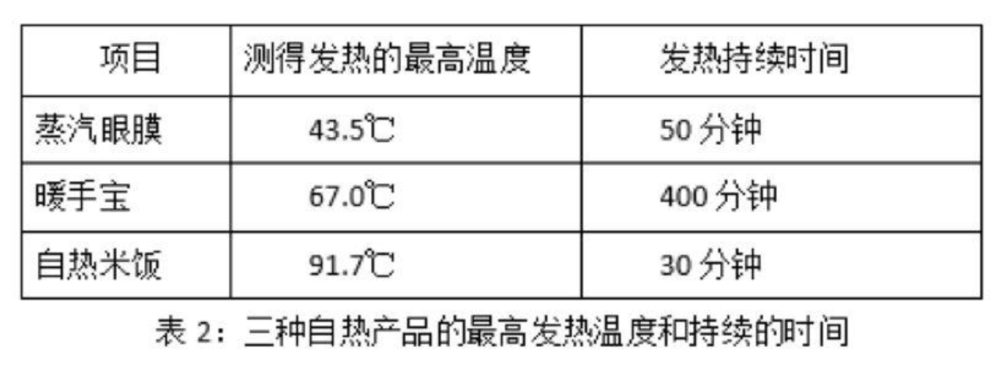 (二)蒸汽眼罩、暖手宝能保持较长时间发热,蒸汽米饭的持续保温时间是三者中最短,这主要是因为自热米饭的发热原理是通过水与生石灰的作用,而其余两种是铁粉与氧气的反应能保持持续发热的时间比较长,并且里面还有蛭石、活性炭等材料能起到保温作用。