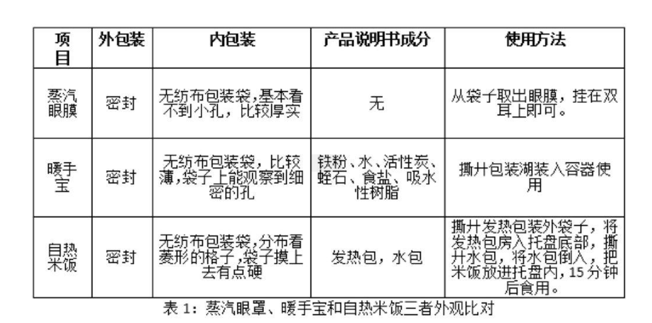 (一)蒸汽眼罩、暖手宝和自热米饭的发热原理基本相同,但自热米饭稍有差异。它们三个都是通过铁粉与空气中的氧气接触发生化学反应,从而发出热量的。但是,理论上自热米饭能够迅速发热至120℃,但实际温度最高为91.7℃,我推测资料中的理论值可能指的是蒸汽的温度。